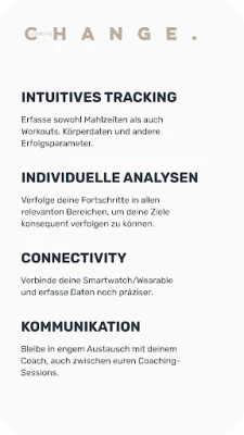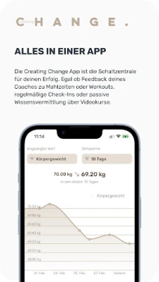 Creating Change ne se contente pas de vous accompagner, elle vous aide à visualiser votre progression avec des analyses claires et motivantes. Chaque effort est mesuré, chaque succès célébré, grâce à des bilans personnalisés qui mettent en lumière votre évolution. Pour une expérience fluide et intégrée, Creating Change se synchronise parfaitement avec Apple Health, consolidant toutes vos données de santé et de fitness en un seul endroit. Et pour un soutien inégalé, échangez directement avec votre coach dédié via notre messagerie intégrée, bénéficiant ainsi de conseils experts et d'un accompagnement personnalisé à chaque étape de votre parcours.