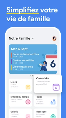 Découvrez un éventail d'outils collaboratifs inclus. Le calendrier partagé, intuitif et coloré, visualise les agendas de tous en un clin d'œil, avec des rappels personnalisables pour ne rien manquer. Gérez les tâches de la maison ou les préparatifs des vacances avec des listes à attribuer, et simplifiez vos courses grâce à des listes partagées que toute la famille peut enrichir. Partagez vos recettes favorites, échangez des messages instantanés avec notifications directes, et créez des galeries privées pour vos souvenirs précieux. Un répertoire familial centralise également tous les contacts essentiels, du baby-sitter aux grands-parents.