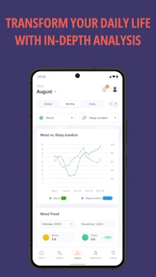 Pour une compréhension affûtée de votre univers émotionnel, Lasting Change intègre un système de suivi intelligent. Consignez votre humeur, vos niveaux de stress, la qualité de votre sommeil et vos progrès en matière d'habitudes. Visualisez des aperçus clairs des tendances qui influencent votre bien-être, vous permettant d'identifier ce qui vous soutient ou ce qui vous épuise. Chaque petite étape est valorisée, transformant les efforts quotidiens en une progression tangible et significative. La personnalisation de votre expérience est primordiale, tout comme la sécurité de vos données : elles sont chiffrées, protégées et entièrement sous votre contrôle, avec la liberté de les gérer à tout moment au sein de l'application.