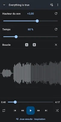 Music Speed Changer modifie la vitesse des fichiers audio en temps réel sans altérer la hauteur, ou ajuste la hauteur sans changer la vitesse. Cette application est également un boucleur audio, parfaite pour ralentir des sections musicales. Elle offre même la lecture inversée de l'audio.