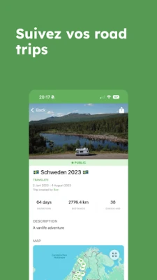 Libérez votre esprit d'aventure et tracez votre propre chemin avec StayFree Vanlife App, le compagnon incontournable pour chaque voyageur en van ou en camping-car. Plongez dans notre vaste répertoire de plus de 50 000 emplacements, allant des havres de paix en pleine nature aux aires de stationnement pratiques, en passant par les RV-Parks et les campings établis. Que votre quête soit un refuge au bord d'un lac scintillant, une clairière forestière paisible ou un point de vue imprenable sur la mer, nos 50+ filtres intuitifs vous permettront d'affiner votre recherche et de dénicher l'endroit idéal, enrichi d'informations détaillées et des avis d'autres explorateurs. Une fois votre destination choisie, un simple toucher suffit pour lancer la navigation et vous guider sans encombre vers votre prochaine escale mémorable.