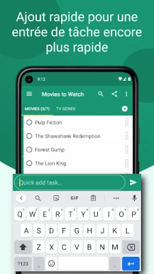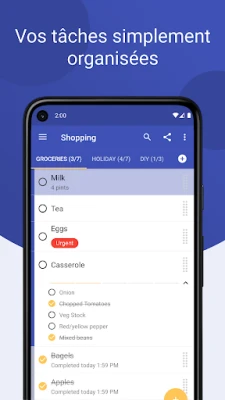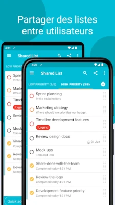 Créez des listes à la fois robustes et visuellement intuitives, personnalisables grâce à un système de codes couleurs qui apporte une nouvelle dimension à votre organisation. La gestion de vos priorités devient un jeu d'enfant avec des gestes fluides : un simple glisser-déposer réordonne vos éléments, tandis qu'un balayage discret les supprime en un instant. Ajouter une nouvelle tâche n'a jamais été aussi rapide : utilisez la fonction d'ajout rapide (compatible avec Android 7.1 et versions ultérieures) ou intégrez-la directement depuis d'autres applications, vous permettant de rester productif sans jamais interrompre votre élan.