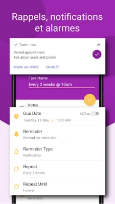 Ne manquez plus jamais une échéance grâce aux rappels intelligents de Tâches, qui délivrent vos notifications au moment précis où vous en avez besoin. Mieux encore, agissez directement depuis la notification : marquez une tâche comme terminée ou reportez-la facilement pour plus tard, sans même ouvrir l'application. Tâches est une solution en constante évolution, enrichie par les suggestions de sa communauté. Votre avis est précieux : contribuez à modeler son avenir et aidez-nous à en faire l'outil d'organisation le plus adapté à vos besoins.