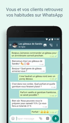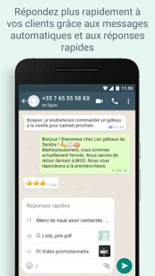 Boostez votre productivité et rationalisez vos échanges comme jamais auparavant. Laissez l'application gérer les communications répétitives grâce aux réponses rapides automatisées et aux messages d'absence, assurant ainsi une présence continue pour votre clientèle. Organisez, filtrez et retrouvez sans effort les discussions cruciales grâce à un système d'étiquettes intelligent. Partagez vos dernières offres ou actualités via des statuts captivants, et offrez une expérience client d'exception en intégrant la gestion des commandes et des règlements** directement au sein de vos conversations.