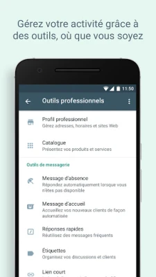WhatsApp Business combine la familiarité de WhatsApp avec des outils dédiés aux entreprises. Cette application gratuite vous aide à travailler plus efficacement, à susciter la confiance et à développer votre activité. Profitez de fonctionnalités comme les réponses rapides, les messages d'absence et les étiquettes pour optimiser vos échanges.